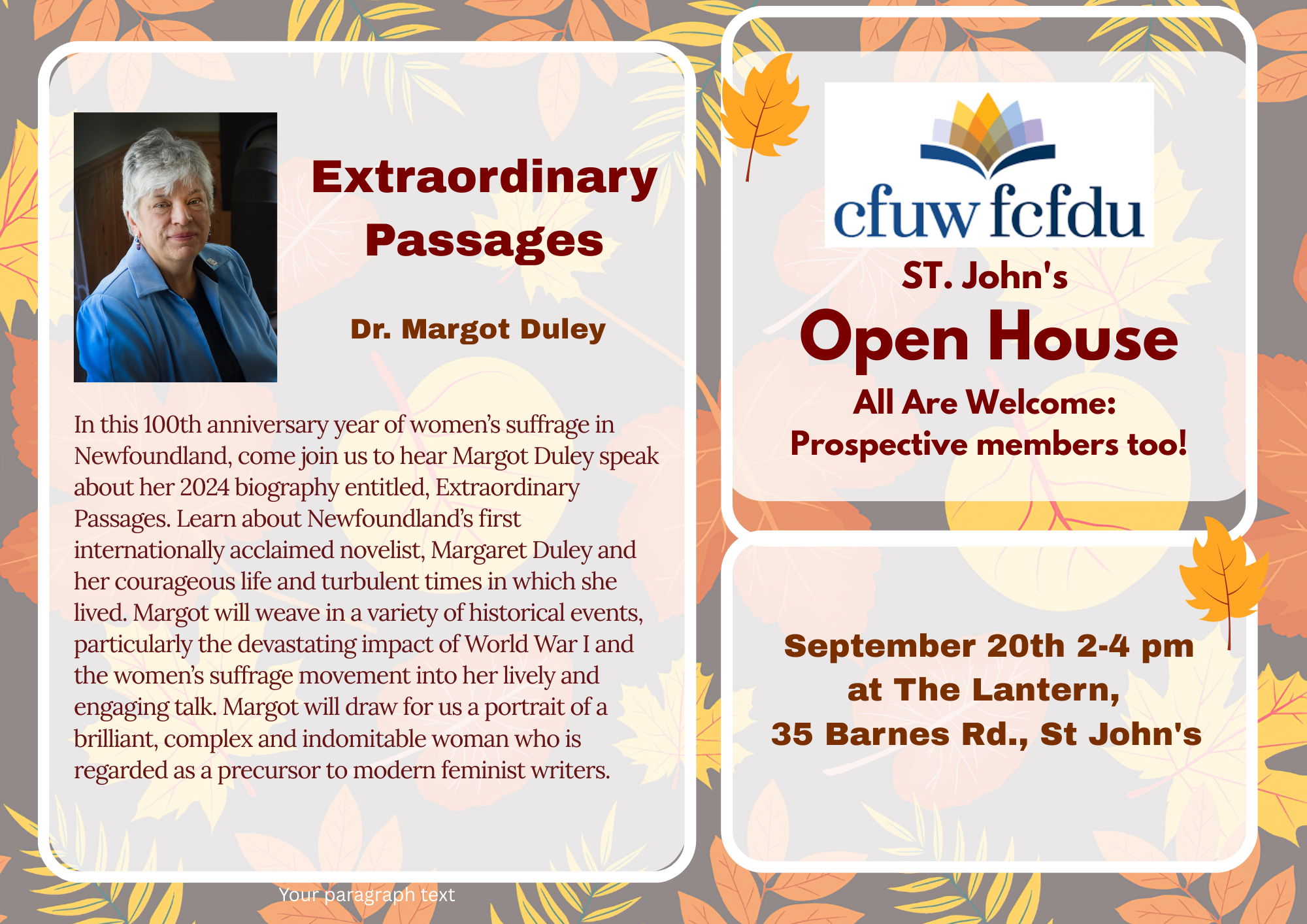 CFUW St. John’s meets the second Tuesday of the month at 7:30 p.m. in Room 4065 of the Alexander Murray Building at MUN. Exceptions are our annual Open House in September and the December and June dinner meetings. There are no meetings in July or August.